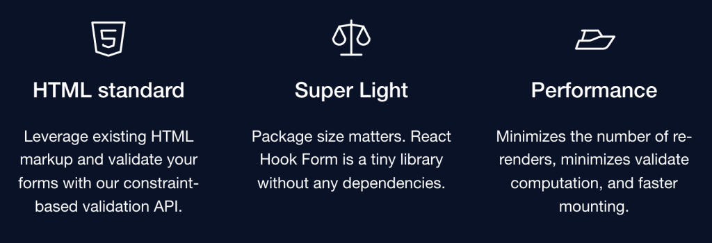 The first is react-hook-form, this is one of the best packages I have used in recent years, out of the box it provides some great hooks and also a global context which allows your form components to remain decoupled. It also has great support for TypeScript, you can use generics to enforce strong typing when getting/ setting form data. There are great docs here. One of the best things about this form lib is their attention to performance and willingness to adopt HTML standards, instead of reinventing the wheel.