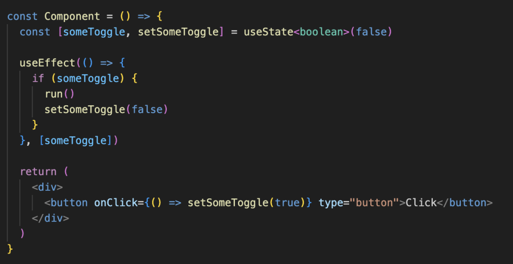 The problem here is – we relying on React specific patterns for something that could easily be handled natively. Specifically – there is absolutely no need to utilize component state + post render effect when we can simply call the logic in the native event handler passed to button.